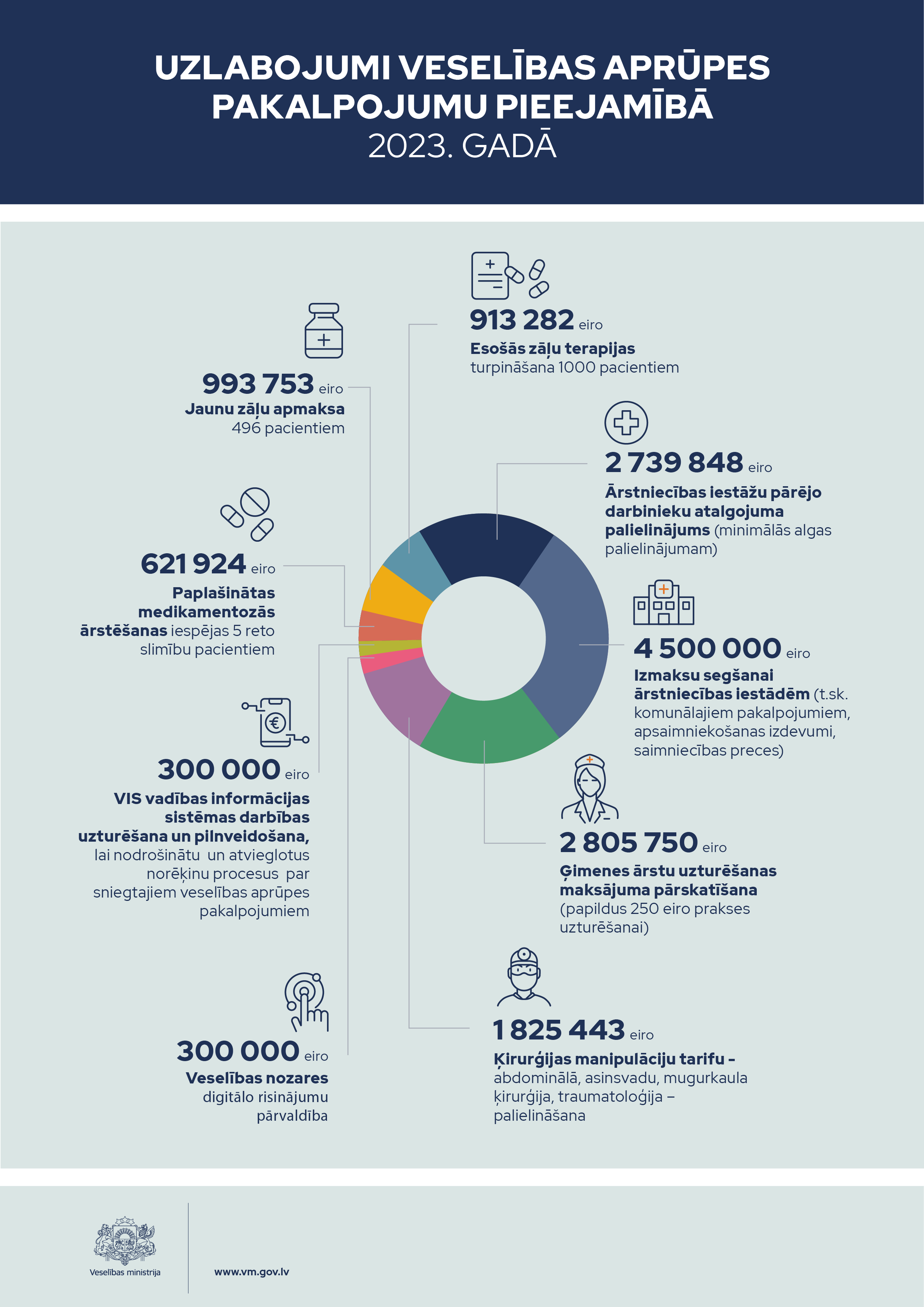Veselības ministrija skaidro, ka 1,35 miljardi eiro tiks novirzīti ambulatoro un stacionāro veselības aprūpes pakalpojumu apmaksai: ģimenes ārstu praksēm, laboratoriskajiem izmeklējumiem, ārstu speciālistu sniegto konsultāciju un diagnostisko izmeklējumu apmaksai, neatliekamās medicīniskās palīdzības un plānveida medicīniskās palīdzības slimnīcās nodrošinājumam, kompensējamiem medikamentiem u.c.. 124 miljoni eiro paredzēti specializētajai veselības aprūpei: neatliekamās medicīniskās palīdzības, asins un asins komponentu nodrošinājumam, tiesu medicīniskās ekspertīzes un antidopinga politikas īstenošanai. 59 miljoni eiro - augstākajai medicīnas izglītībai, bet 15 miljoni - veselības aprūpes finansējuma administrēšanai un Ārstniecības riska fonda darbībai. 11,3 miljoni eiro plānoti slimību profilakses, veselības veicināšanas un ārstniecības pakalpojumu uzraudzībai. 32,3 miljoni eiro tiks novirzīti Eiropas struktūrfondu projektu un pasākumu īstenošanai. Nozares vadībai paredzēti 5,6 miljoni eiro.