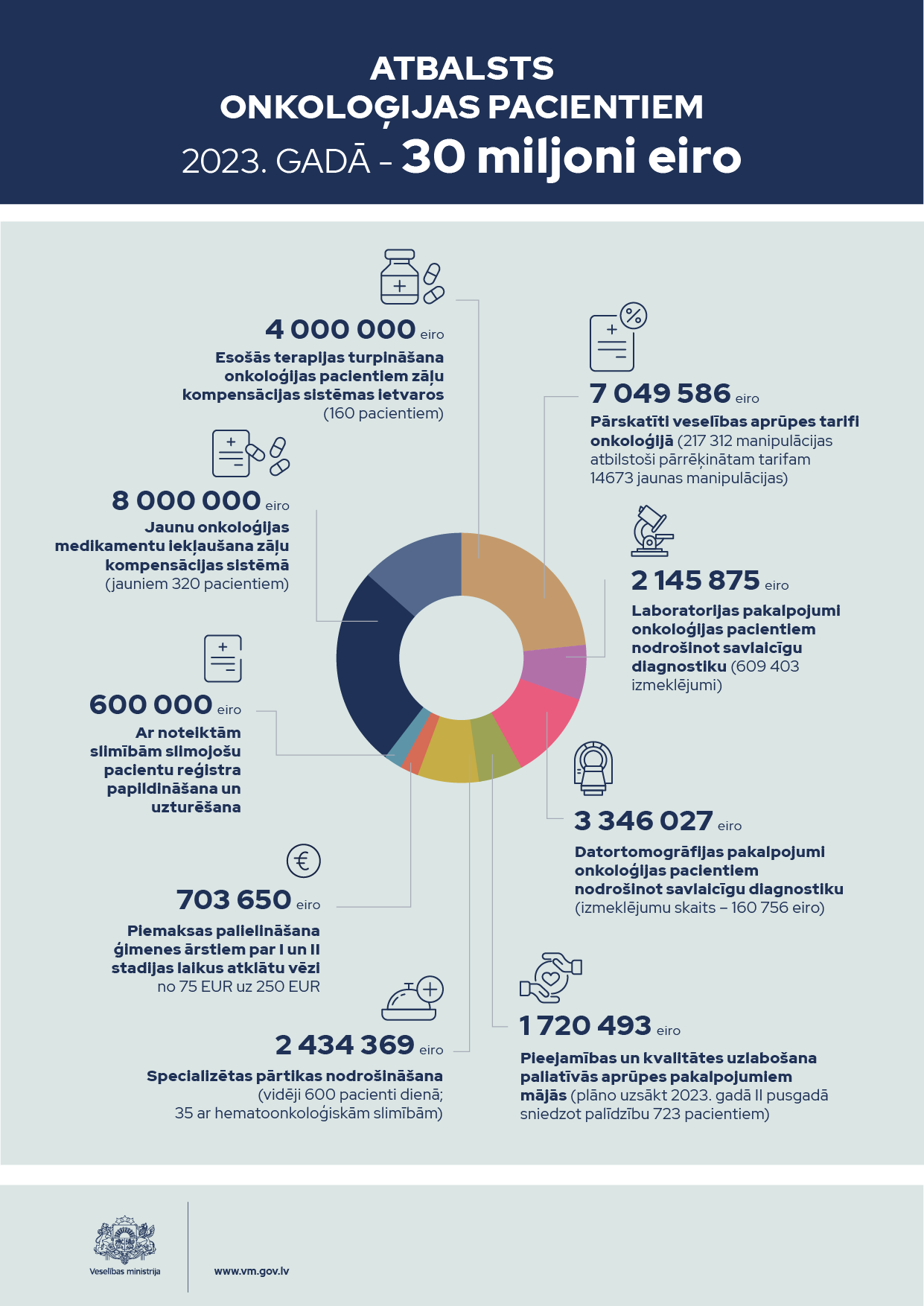 - 30 miljoni eiro tiks novirzīti onkoloģijas jomai - gan kompensējamo medikamentu apmaksai onkoloģijas pacientiem, gan diagnostikas un ārstēšanas pieejamības uzlabošanai, tostarp arī veselības aprūpes pakalpojumu tarifu indeksācijai. Onkoloģija ir viena no veselības jomas prioritātēm, onkoloģijas plāns 2022. - 2024. gadam paredz vēža izplatības riska faktoru mazināšanu, profilakses, kā arī dažāda veida ārstniecības pieejamības un vēža pacientu aprūpes uzlabošanu;