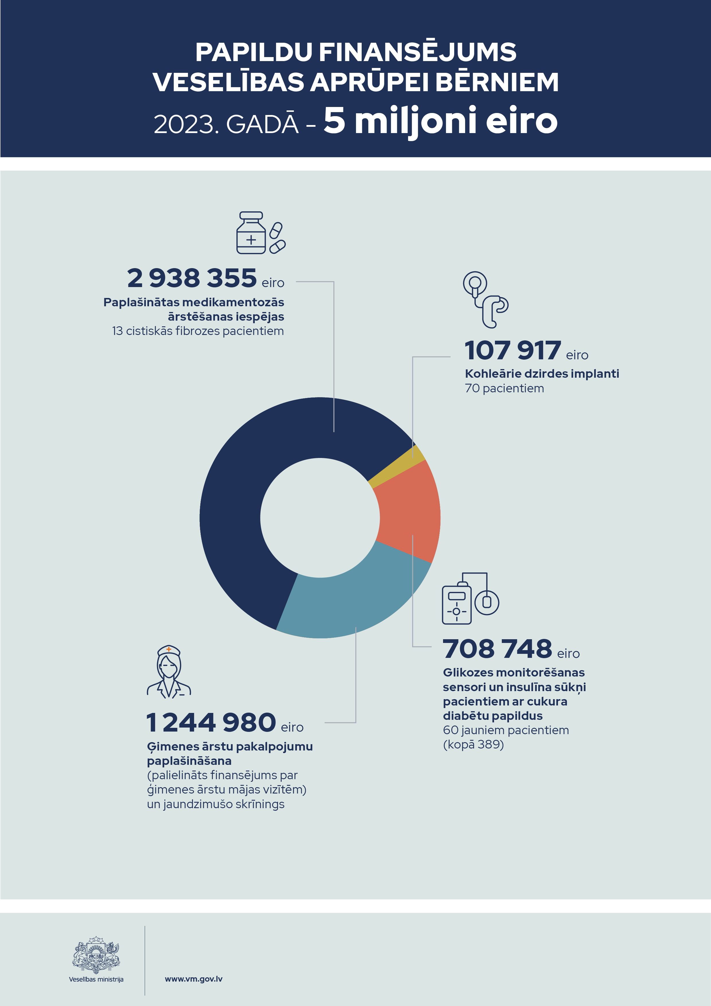 - 5 miljonus eiro novirzīs veselības aprūpes uzlabošanai bērniem, nodrošinot kohleāro implantu un glikozes monitorēšanas sistēmu apmaksu pacientiem ar dzirdes traucējumiem un cukura diabētu, kā arī kompensējamo zāļu apmaksu cistiskās fibrozes pacientiem;